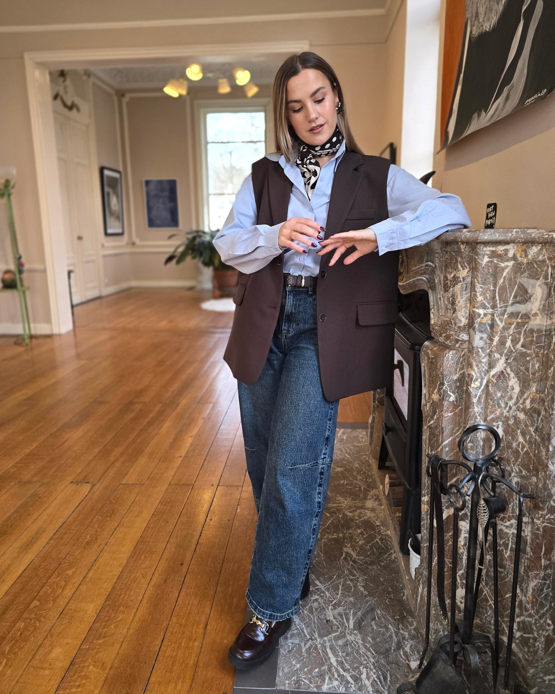 Le choco & Bordeaux s’associent parfaitement avec le chemise ELSA et le foulard VALENCIA