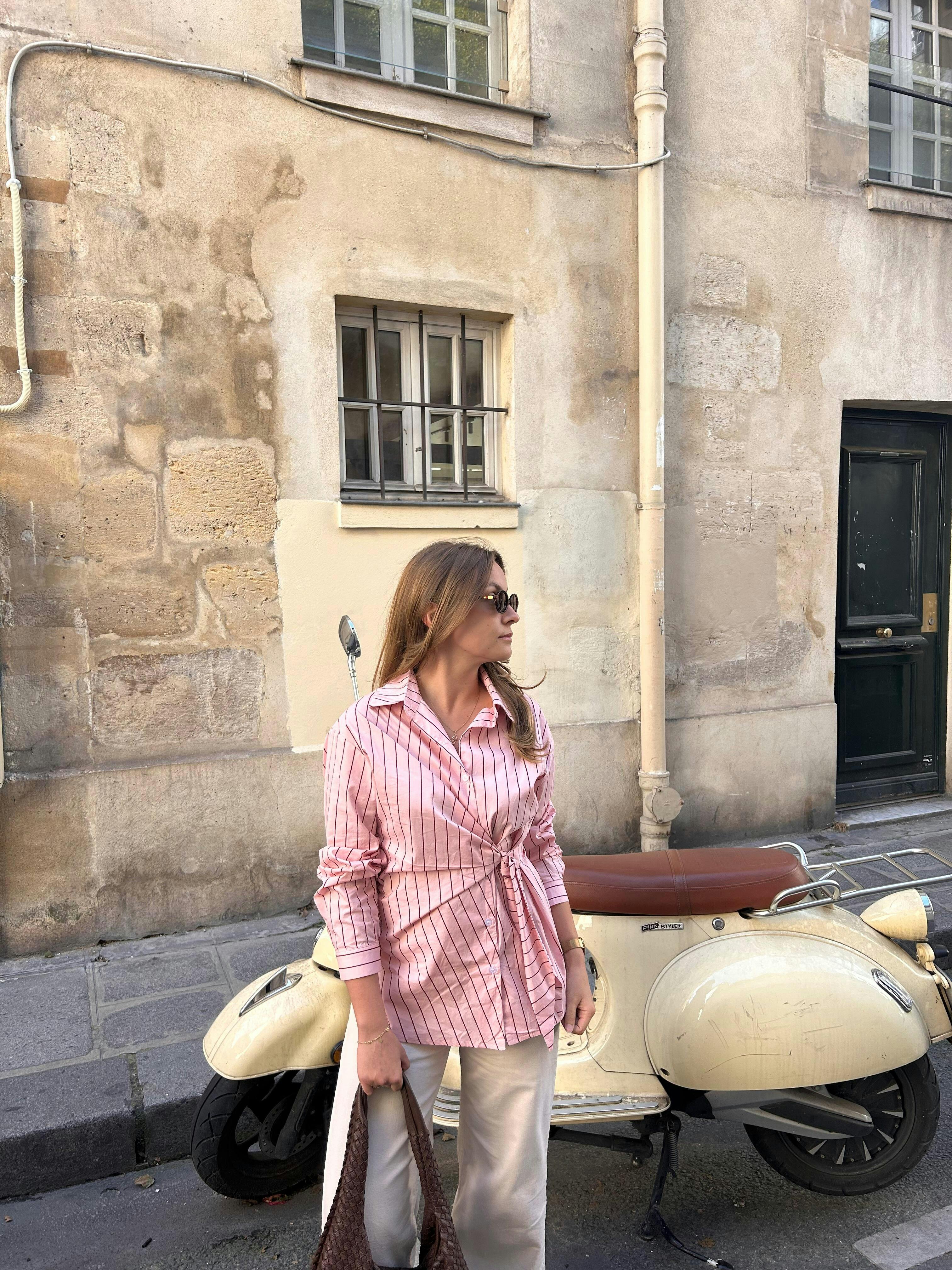 La chemise ELENA est la parfaite alliance entre confort et sophistication. Avec sa coupe droite légèrement oversize et sa ceinture intégrée à nouer à la taille, elle redessine la silhouette tout en restant décontractée. Ses rayures verticales apportent une touche chic et intemporelle, idéale pour un look de bureau raffiné ou une sortie citadine. Elle s’associe parfaitement avec la veste CERISE et le jean BALLON