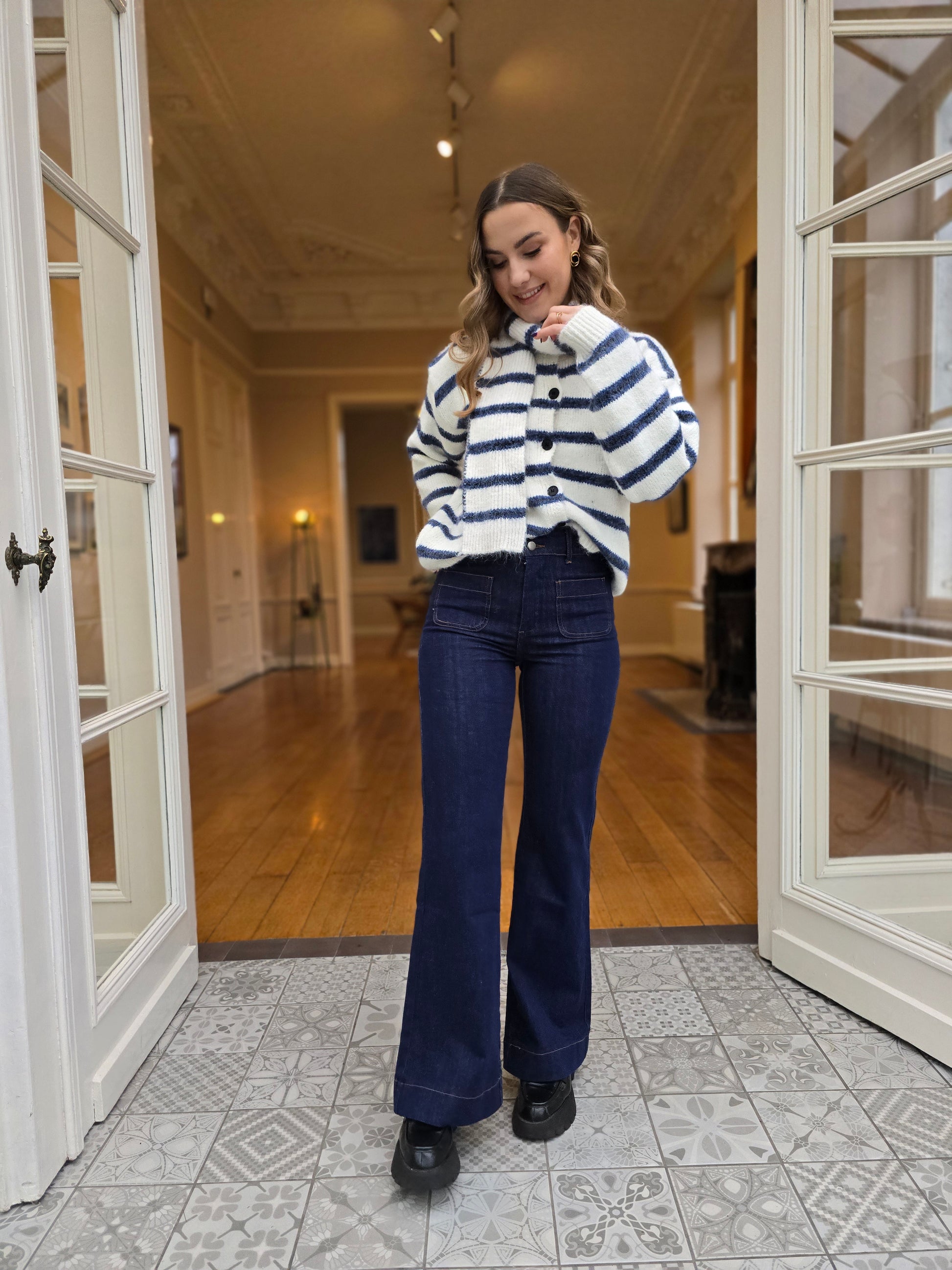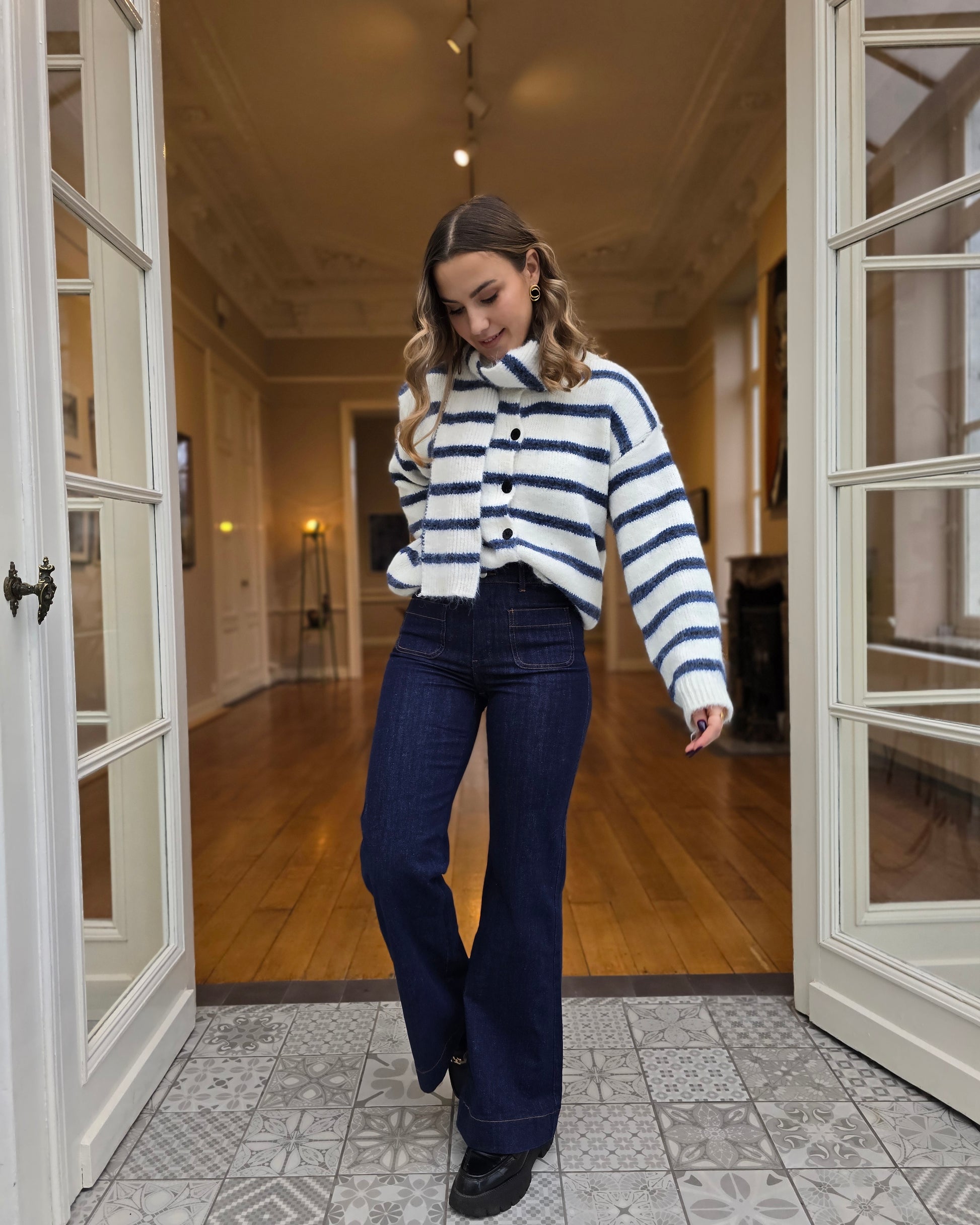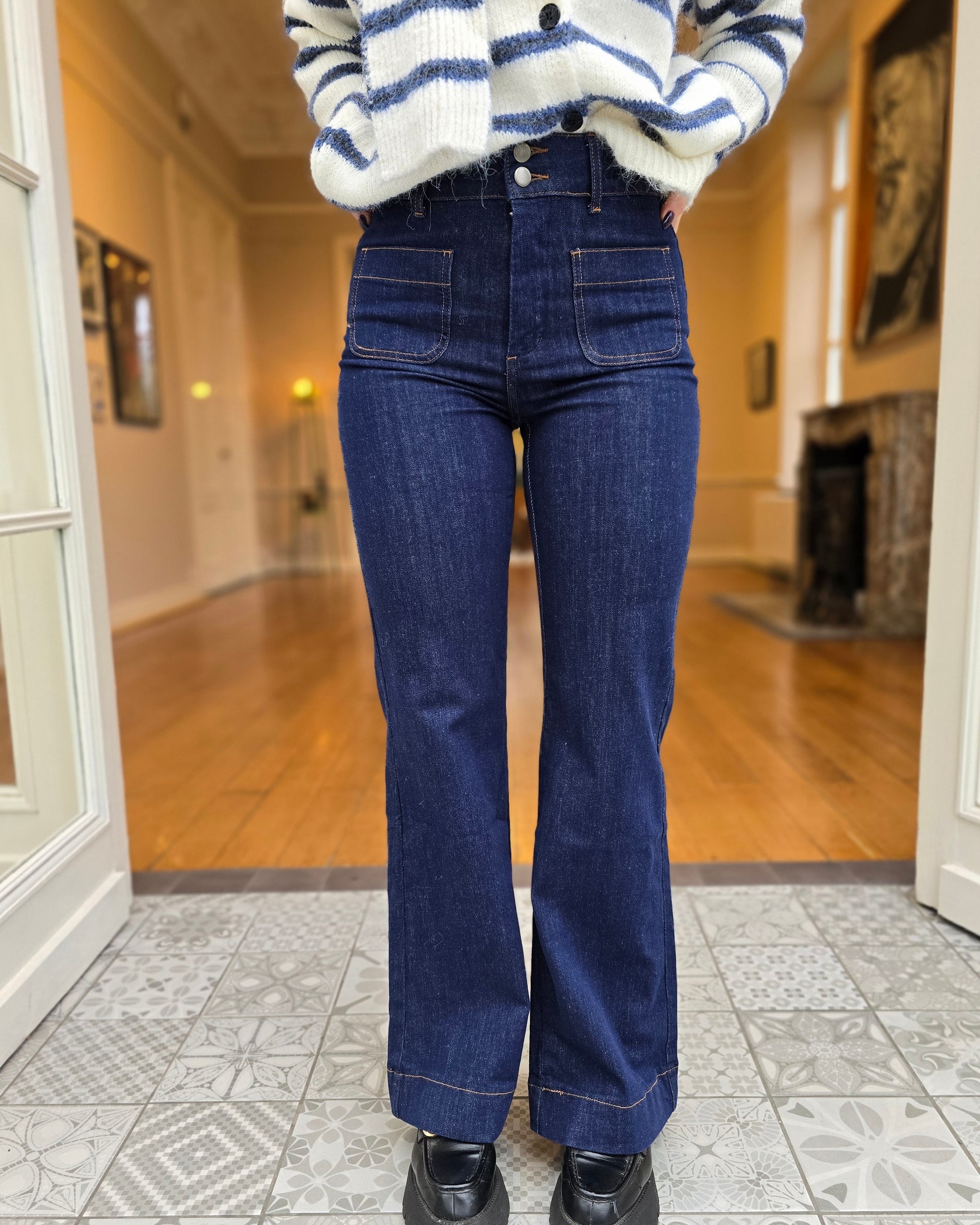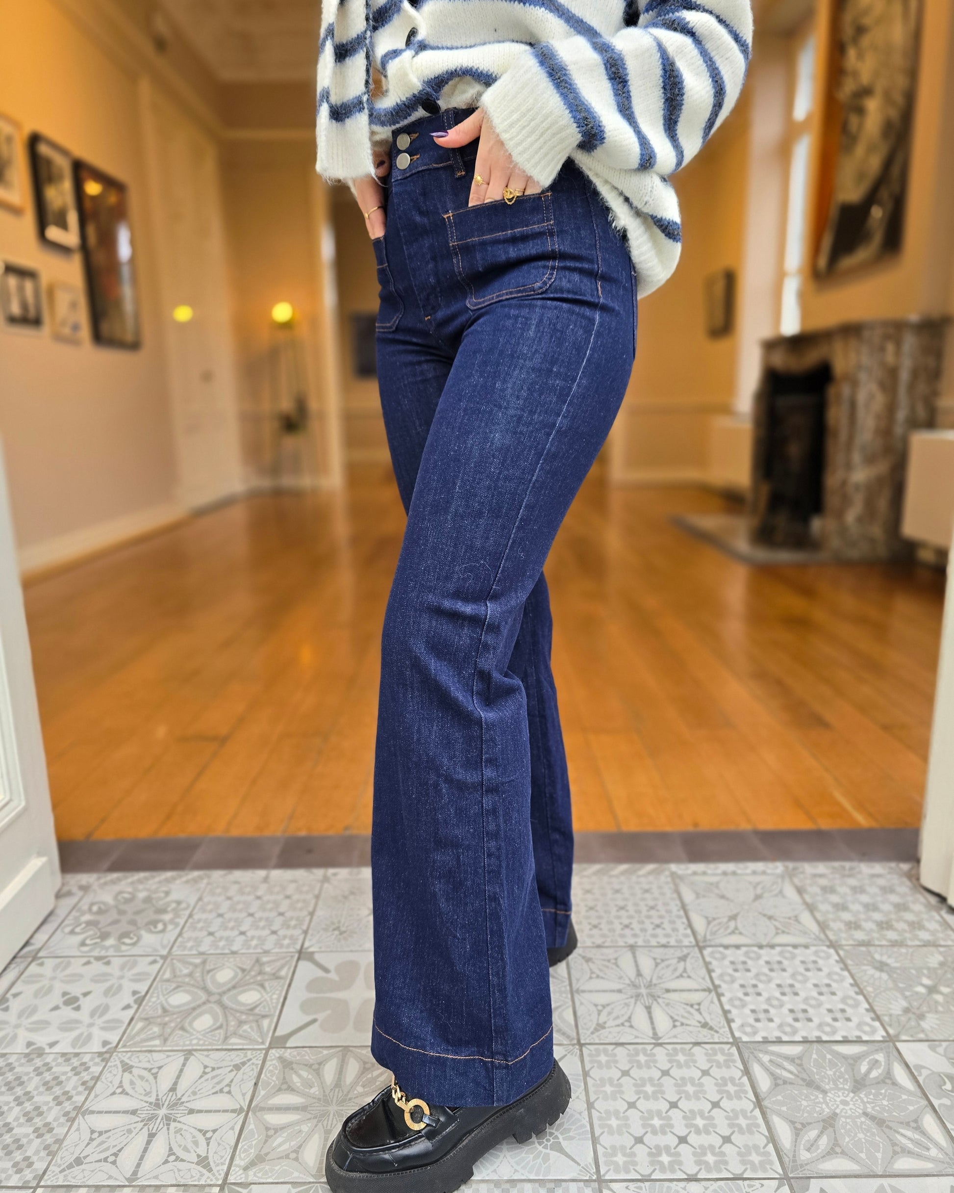 Avec sa taille haute et sa coupe flare parfaitement équilibrée, le jean LAURE allonge la jambe et structure la silhouette avec élégance. Son denim bleu brut lui donne une allure chic et intemporelle, facile à porter du matin au soir.