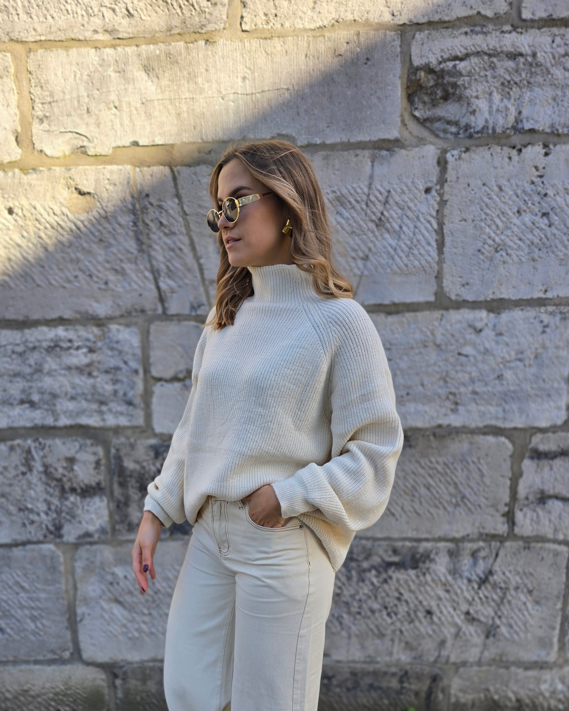 Un indispensable du vestiaire hivernal : le pull crème ADÈLE séduit par sa maille épaisse et côtelée, son col montant structuré et sa coupe légèrement oversize qui assure un confort absolu. Chaleureux sans être trop lourd, il incarne le parfait équilibre entre élégance et douceur.