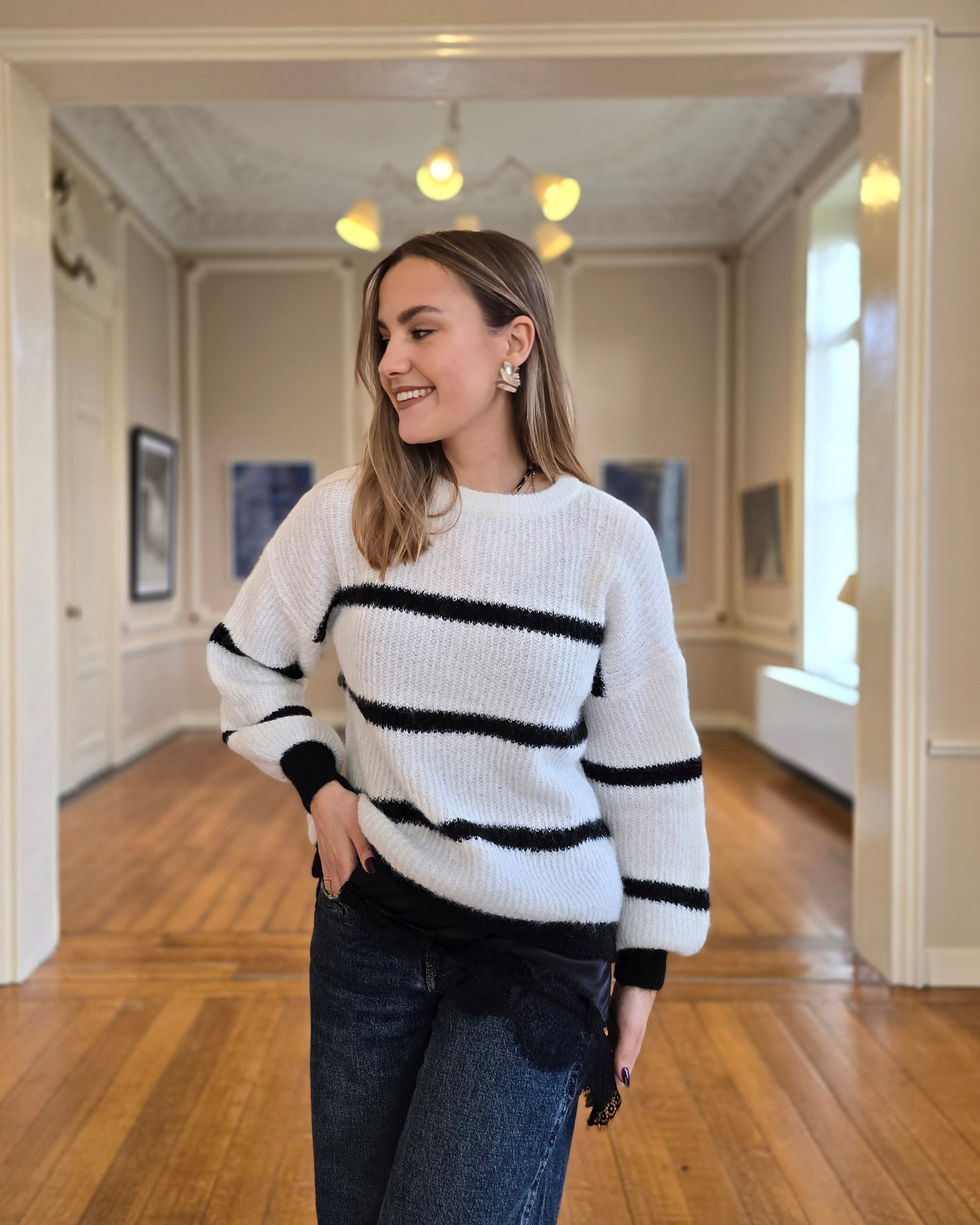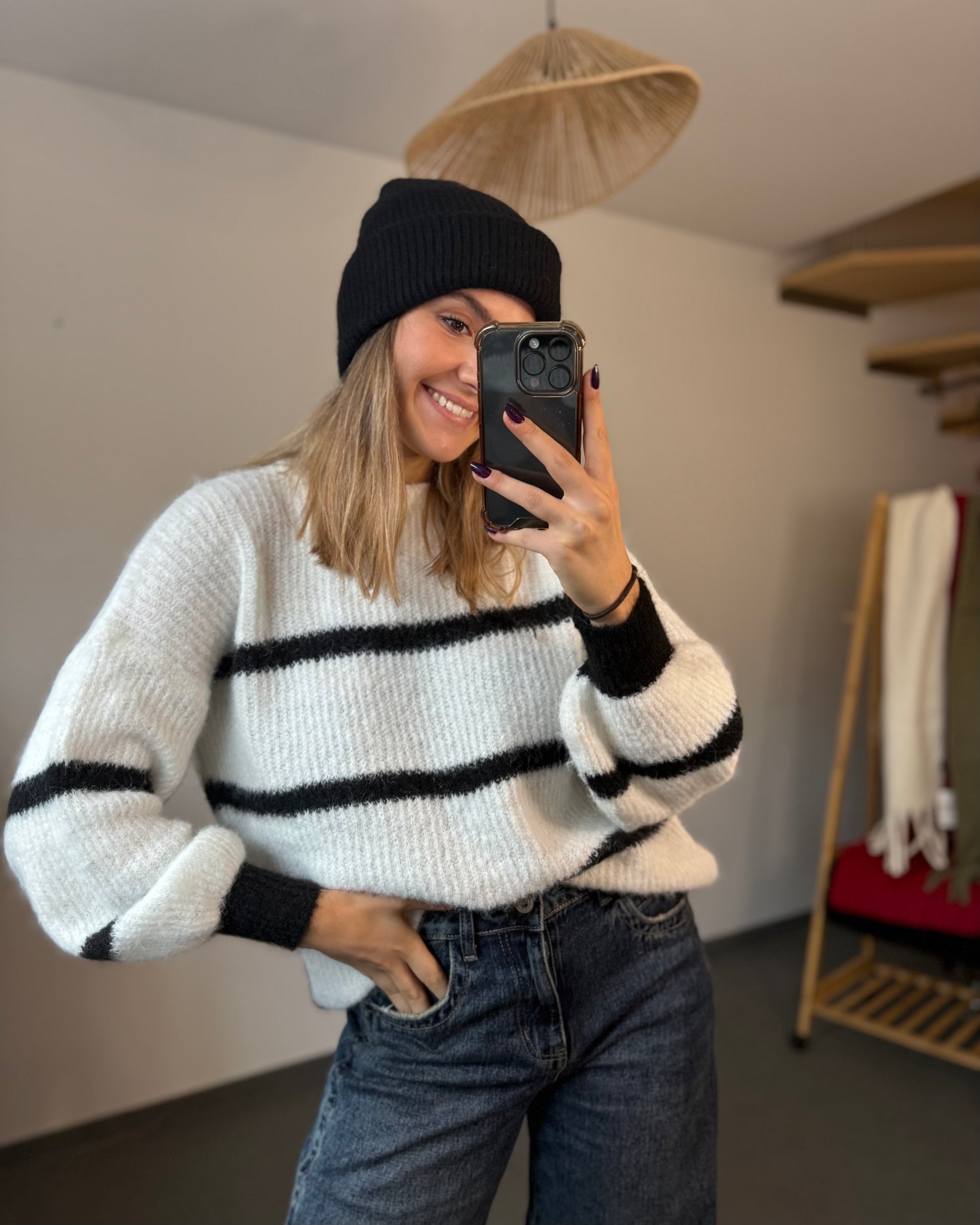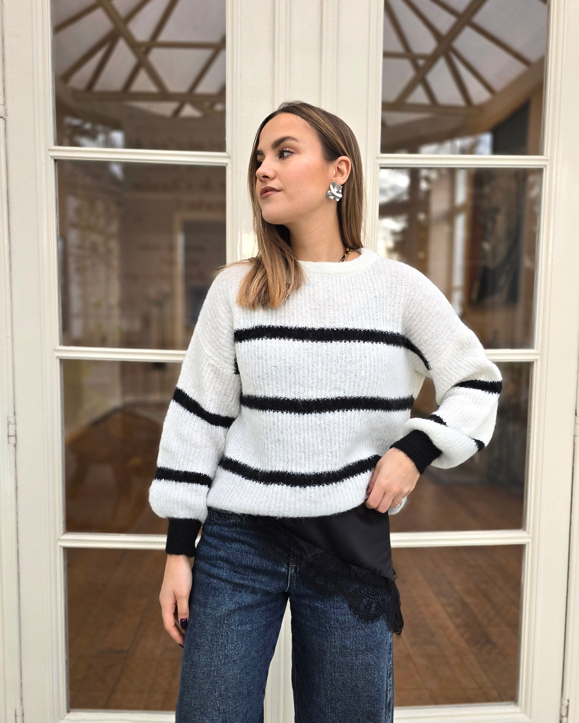 Le pull KELLY est l’alliance parfaite entre confort absolu et élégance parisienne. Sa maille douce et texturée, relevée de rayures noires contrastées, apporte une touche graphique intemporelle. Avec sa coupe loose et son tombé souple, il se porte aussi bien avec un jean qu’avec une jupe midi pour un look effortlessly chic.
