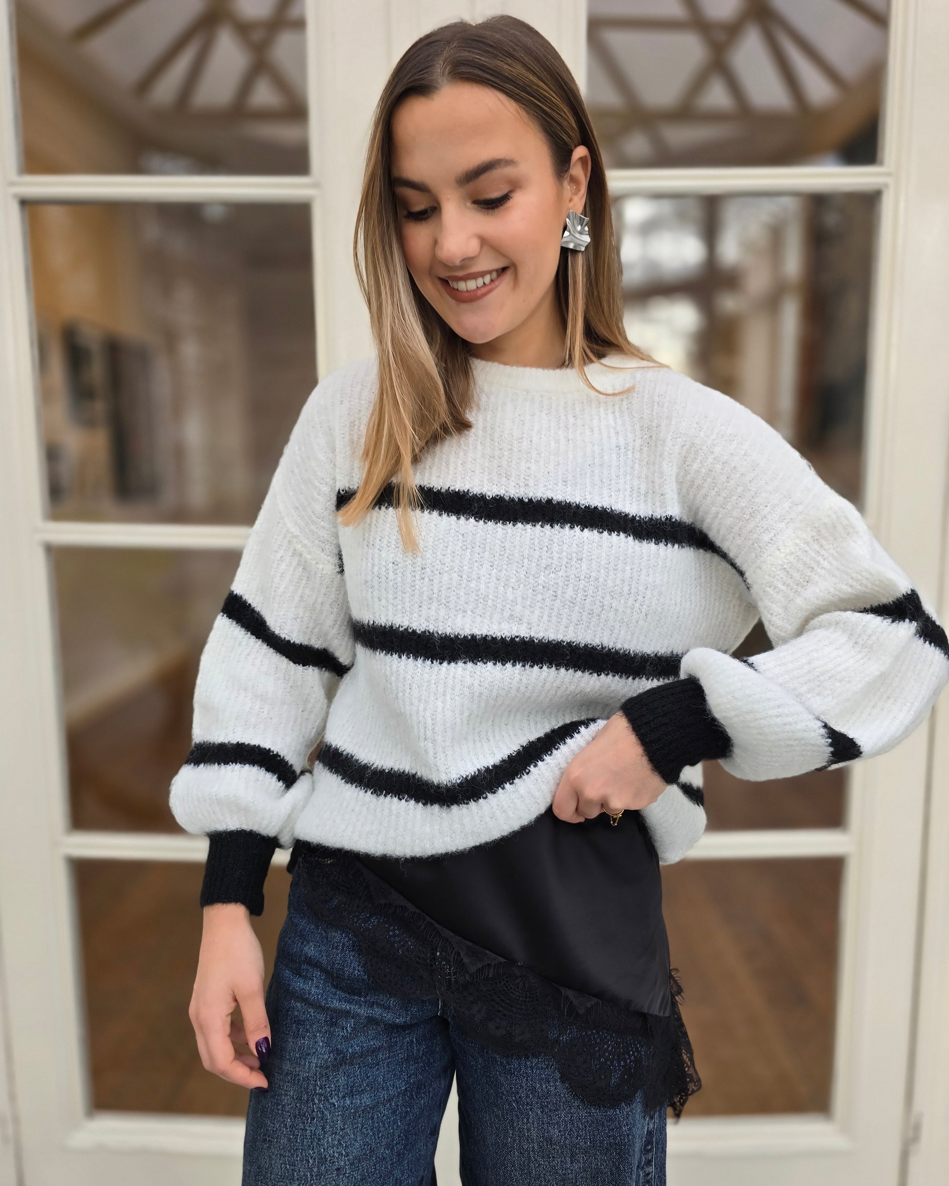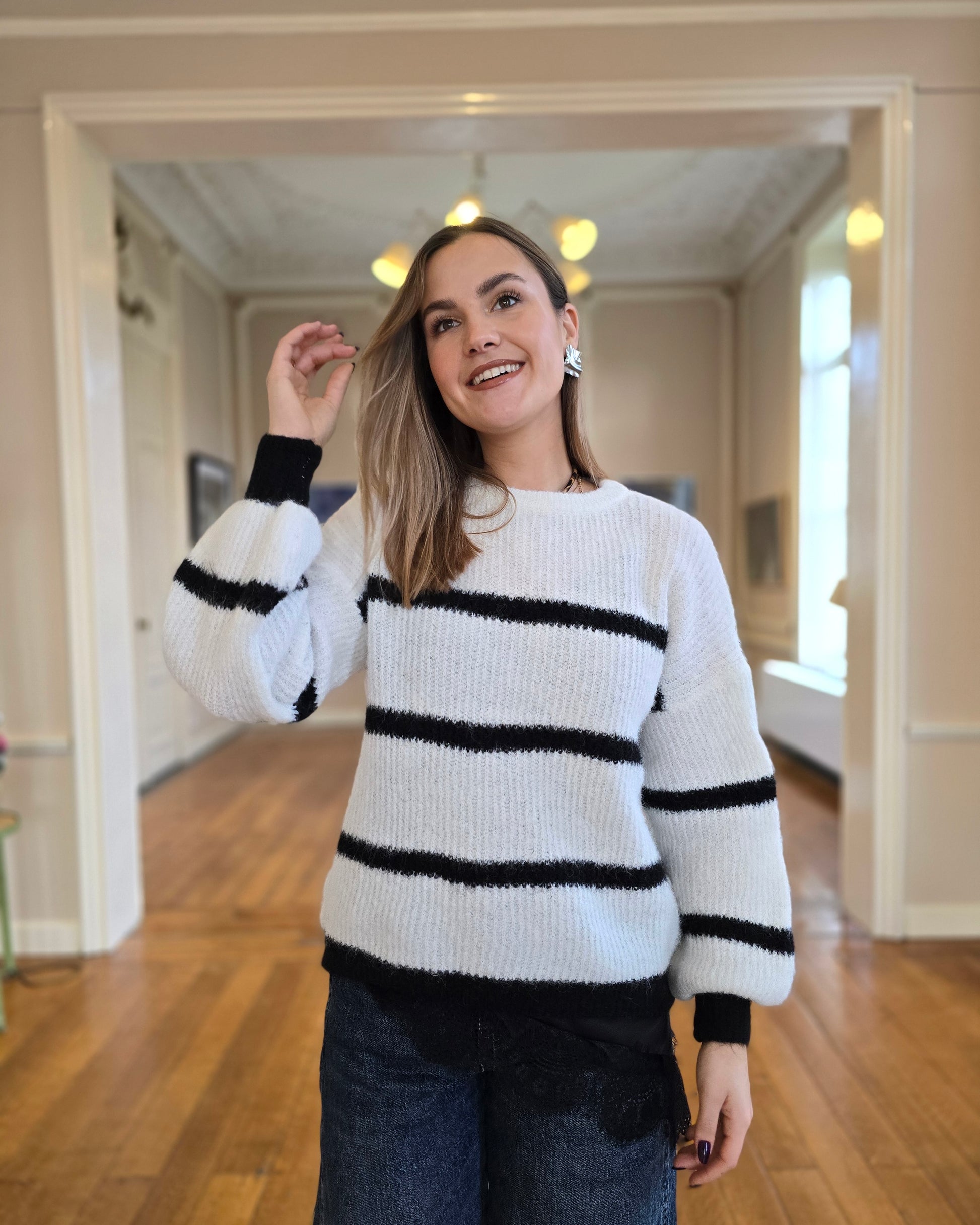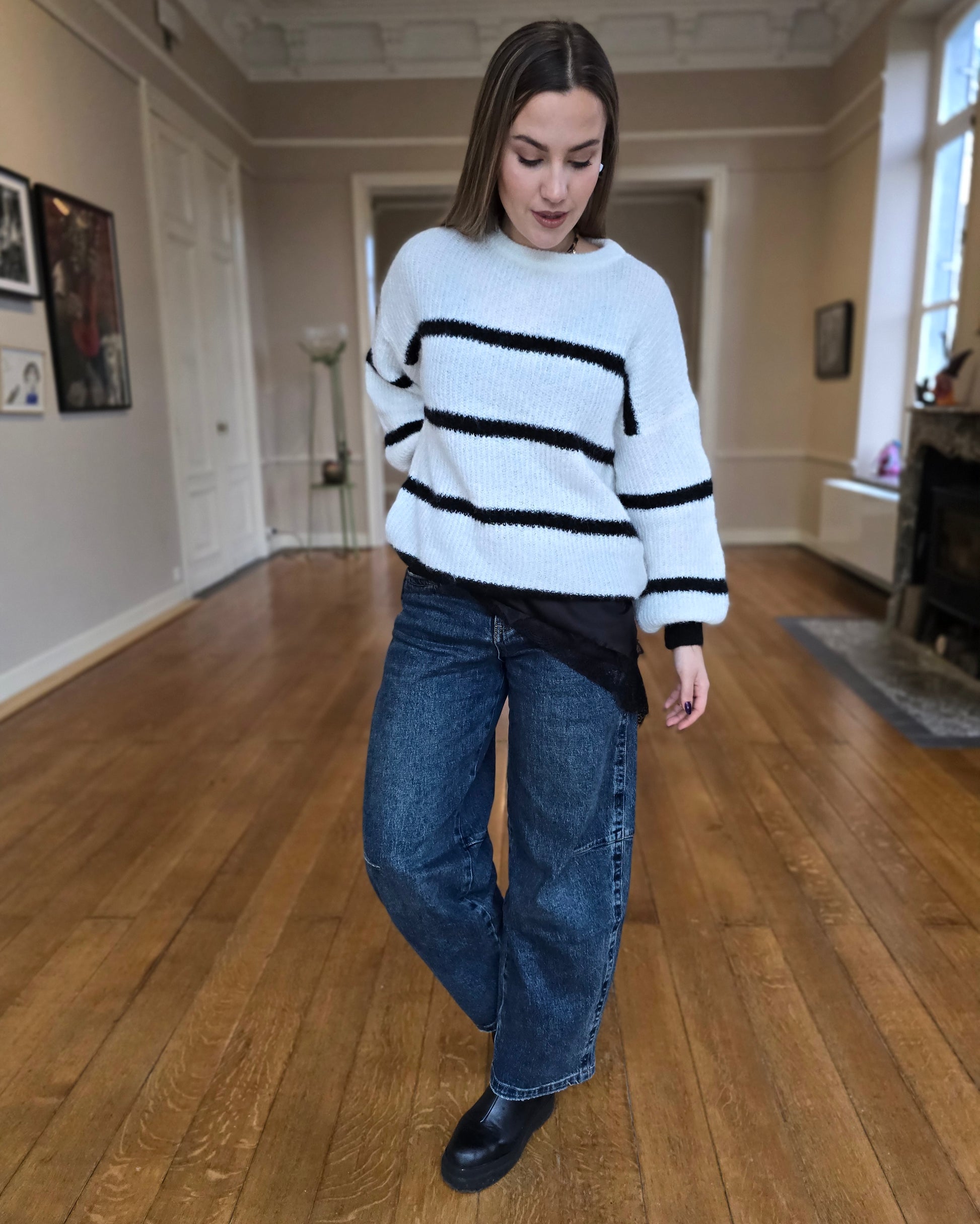 Le pull KELLY est l’alliance parfaite entre confort absolu et élégance parisienne. Sa maille douce et texturée, relevée de rayures noires contrastées, apporte une touche graphique intemporelle. Avec sa coupe loose et son tombé souple, il se porte aussi bien avec un jean qu’avec une jupe midi pour un look effortlessly chic.