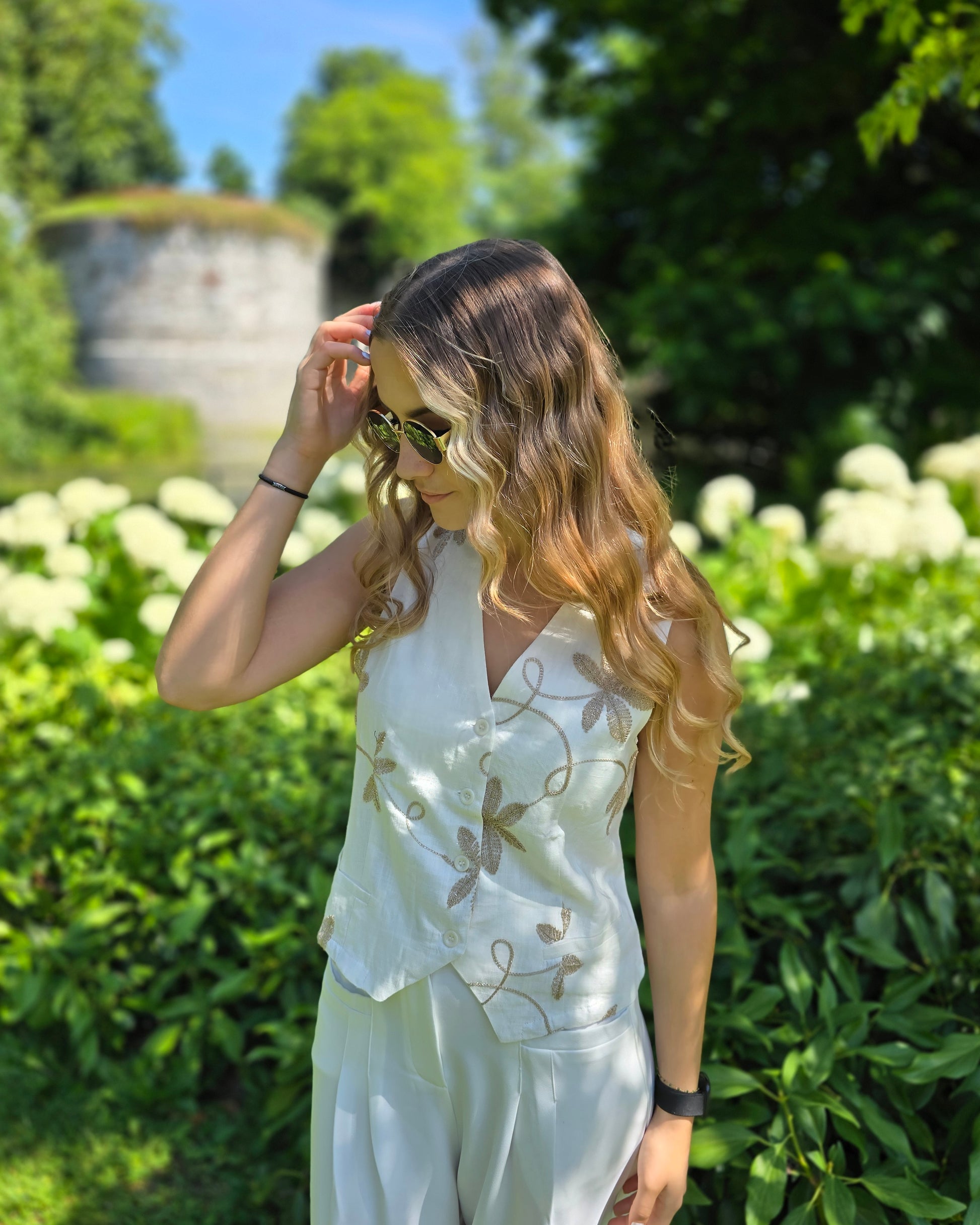 Le top EMILIE à imprimé floral beige est une ode à la douceur et à la légèreté. Confectionné en 100 % coton, il est aussi respirant que confortable, parfait pour les journées chaudes ou les escapades en bord de mer. Son motif fleuri brodé sur fond écru apporte une touche à la fois bohème et élégante.