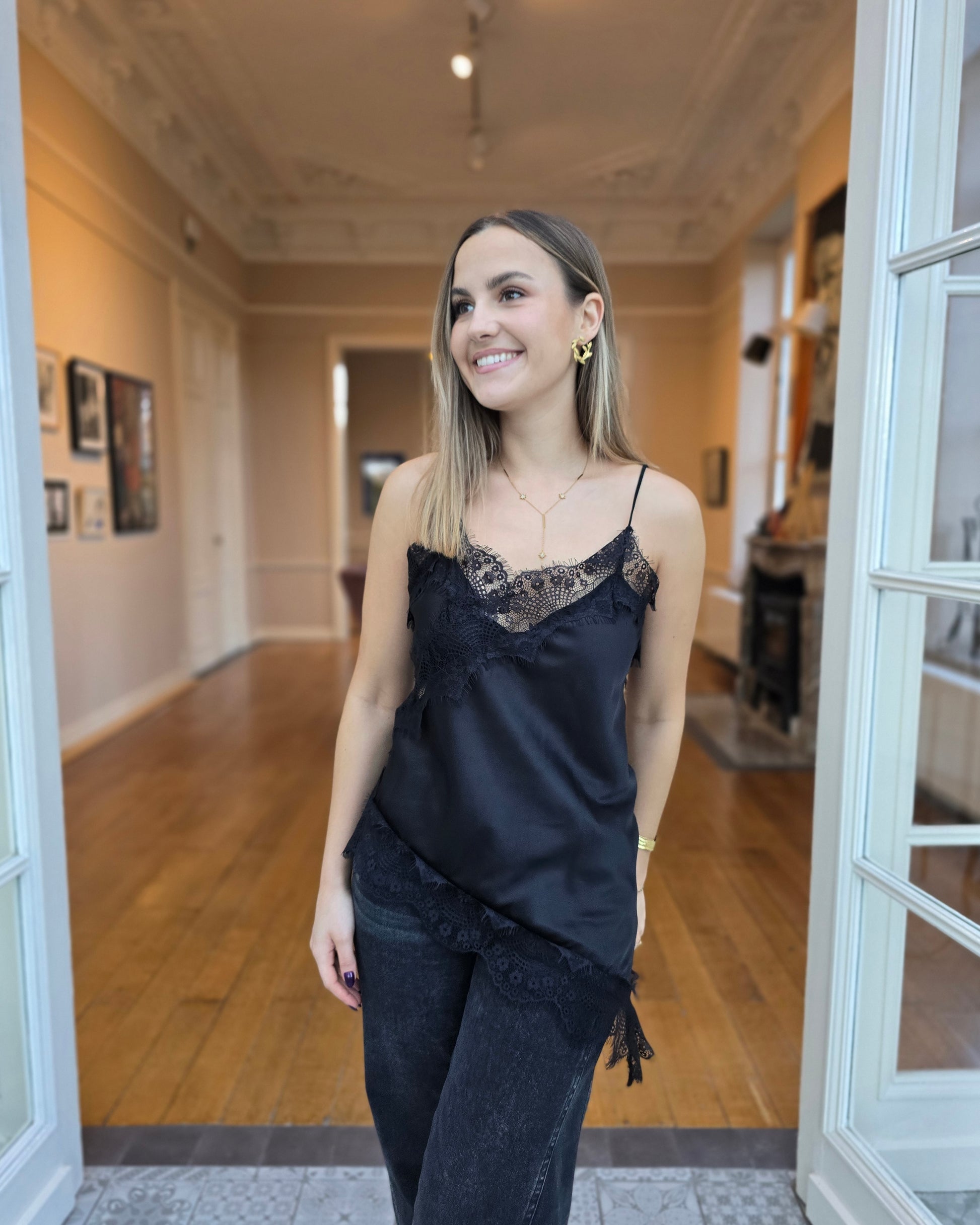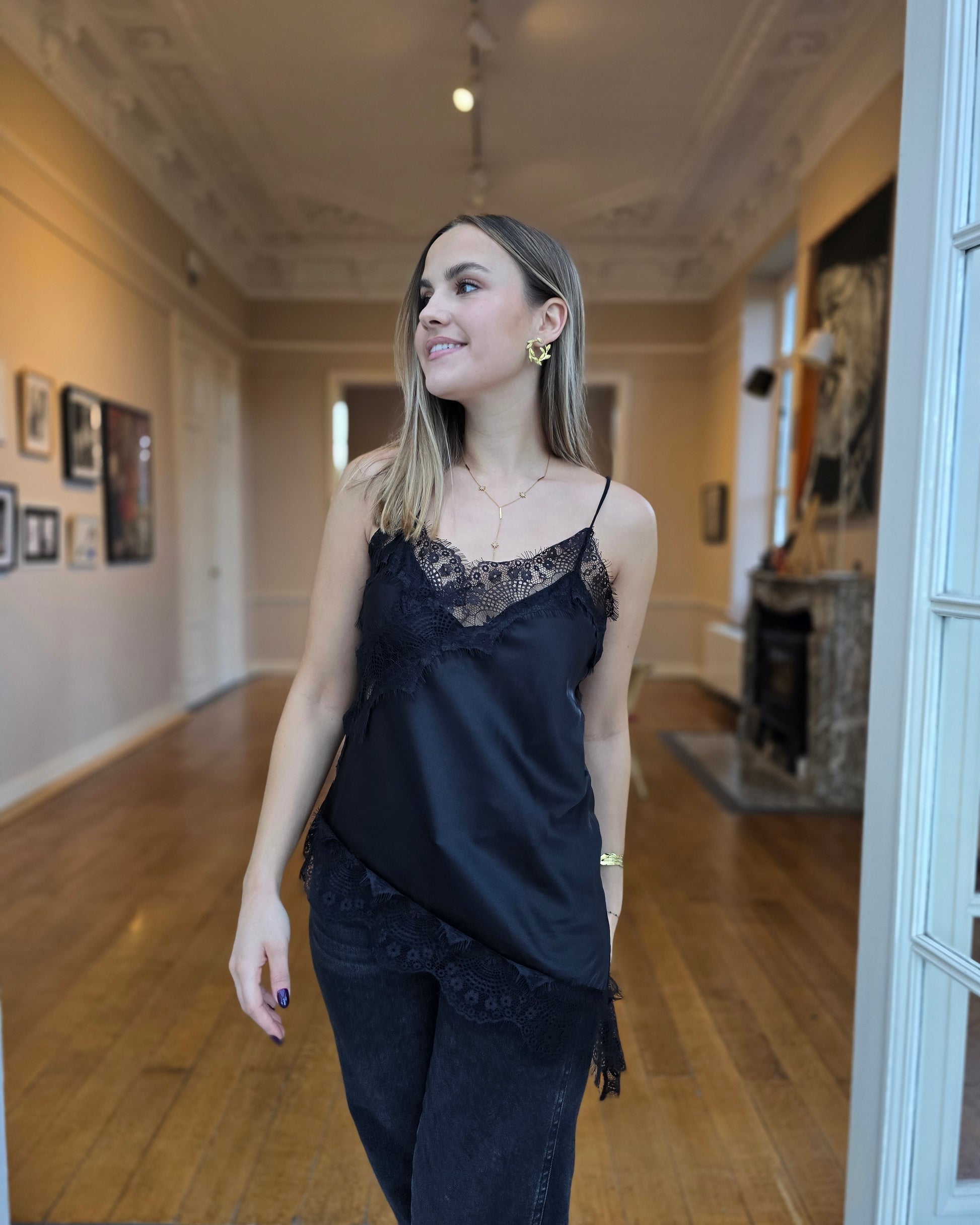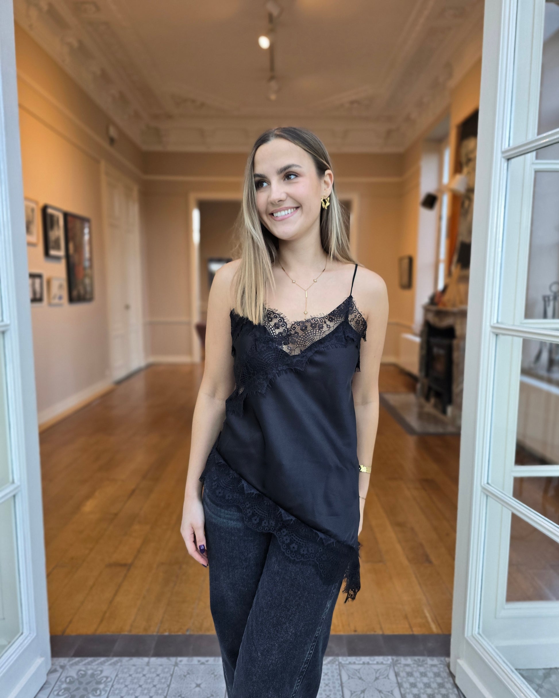 Le top Emy est un débardeur en satin fluide, délicatement rehaussé d’une dentelle fine pour une touche sensuelle et élégante. Sa coupe asymétrique unique offre une silhouette moderne et sophistiquée, parfaite aussi bien pour une soirée que pour sublimer un look casual chic.