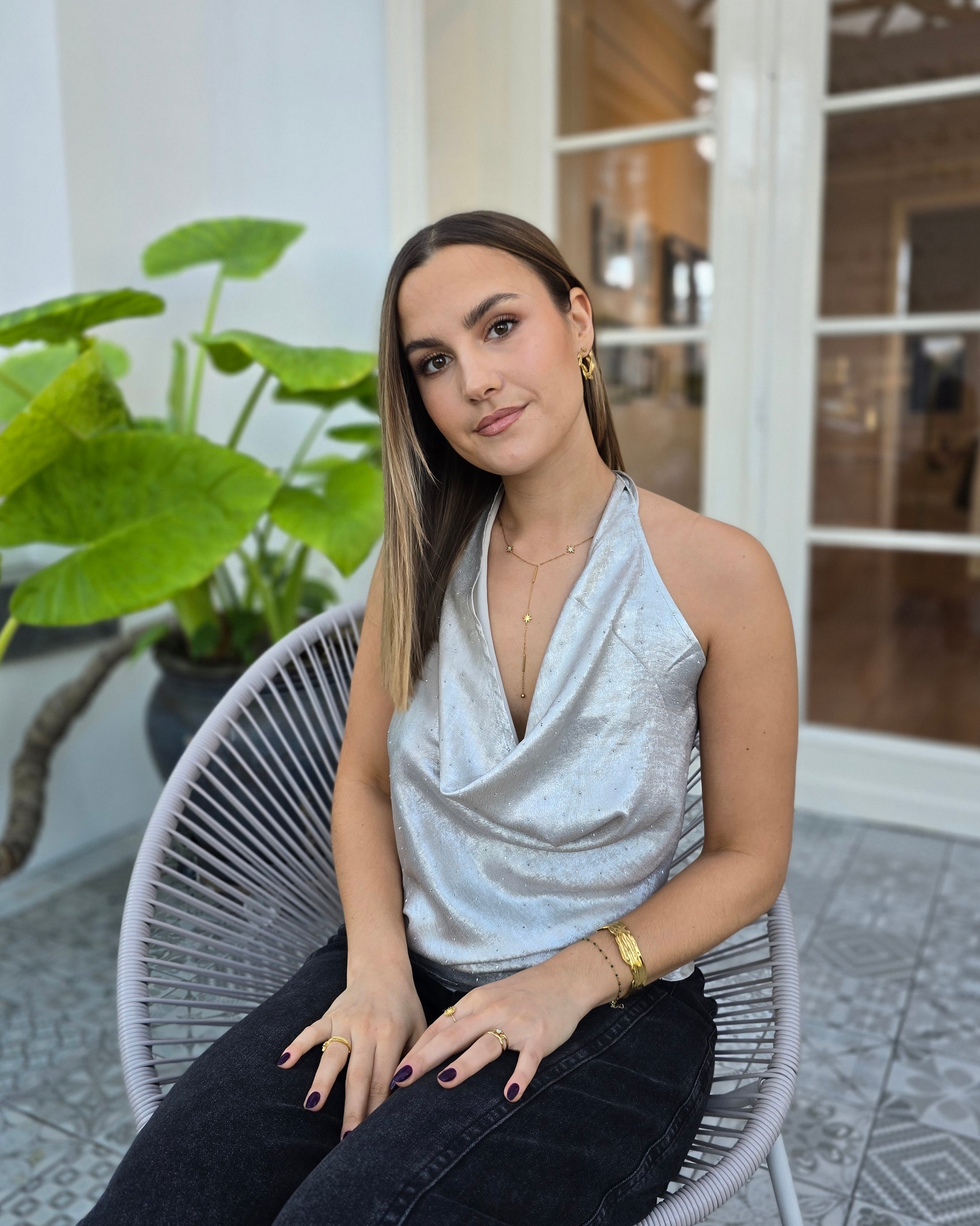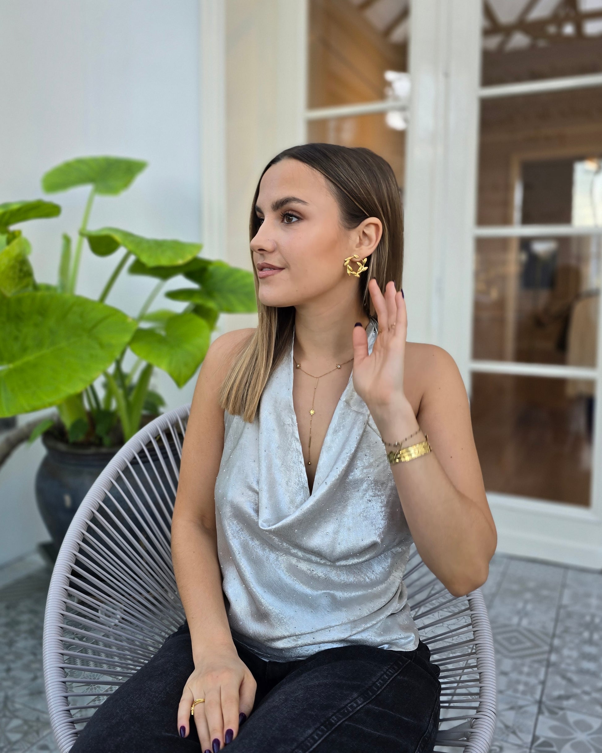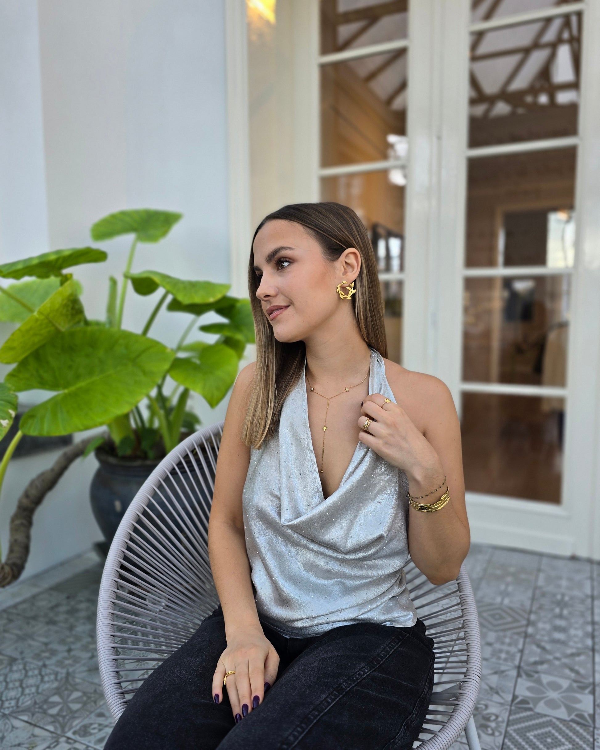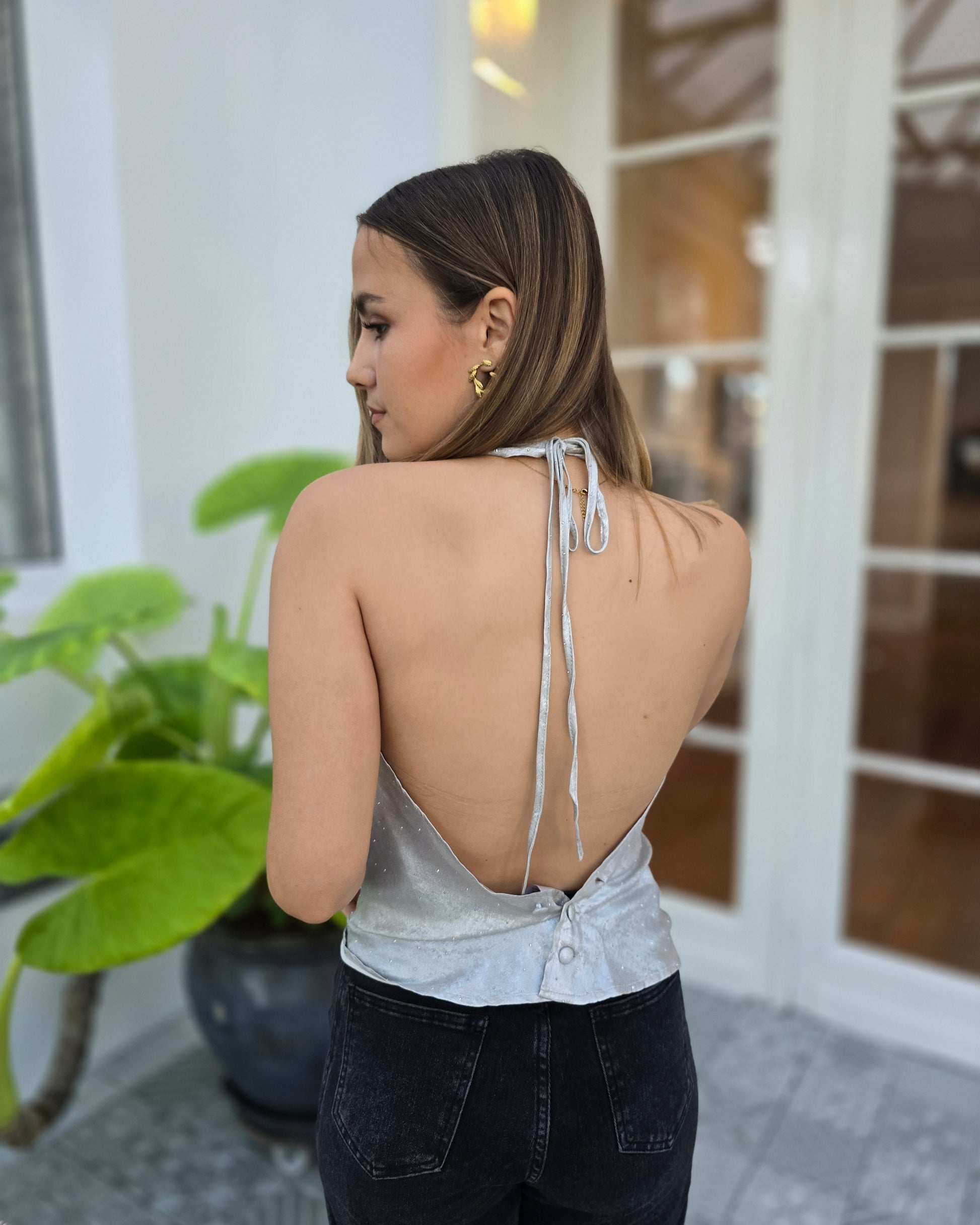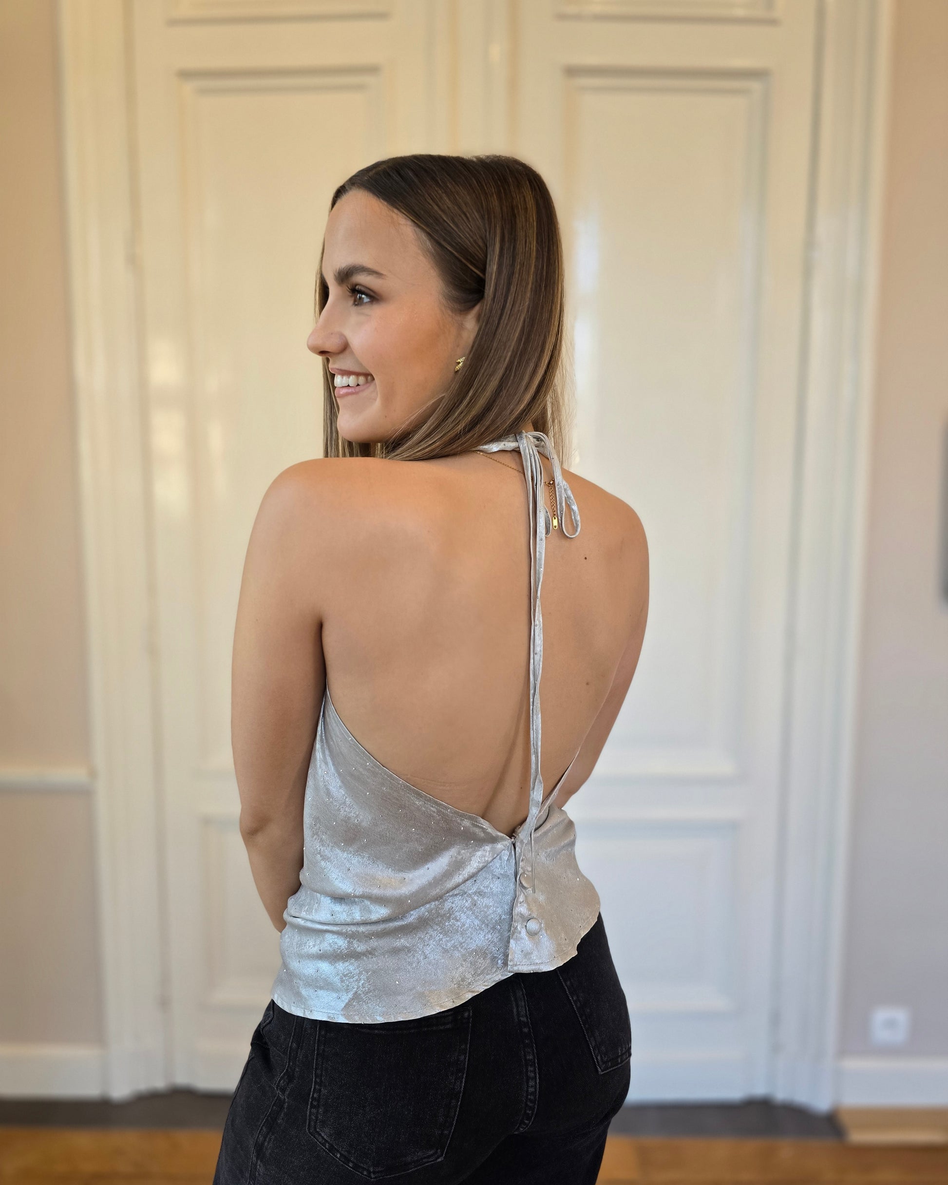 Le top LUNA est la pièce lumineuse qui attire tous les regards. Son drapé élégant, sa matière scintillante et sa coupe dos nu en font un incontournable pour les soirées, dîners et événements où l’on veut briller en subtilité. Léger, fluide et flatteur, il sublime naturellement la silhouette tout en apportant une touche glamour sophistiquée.