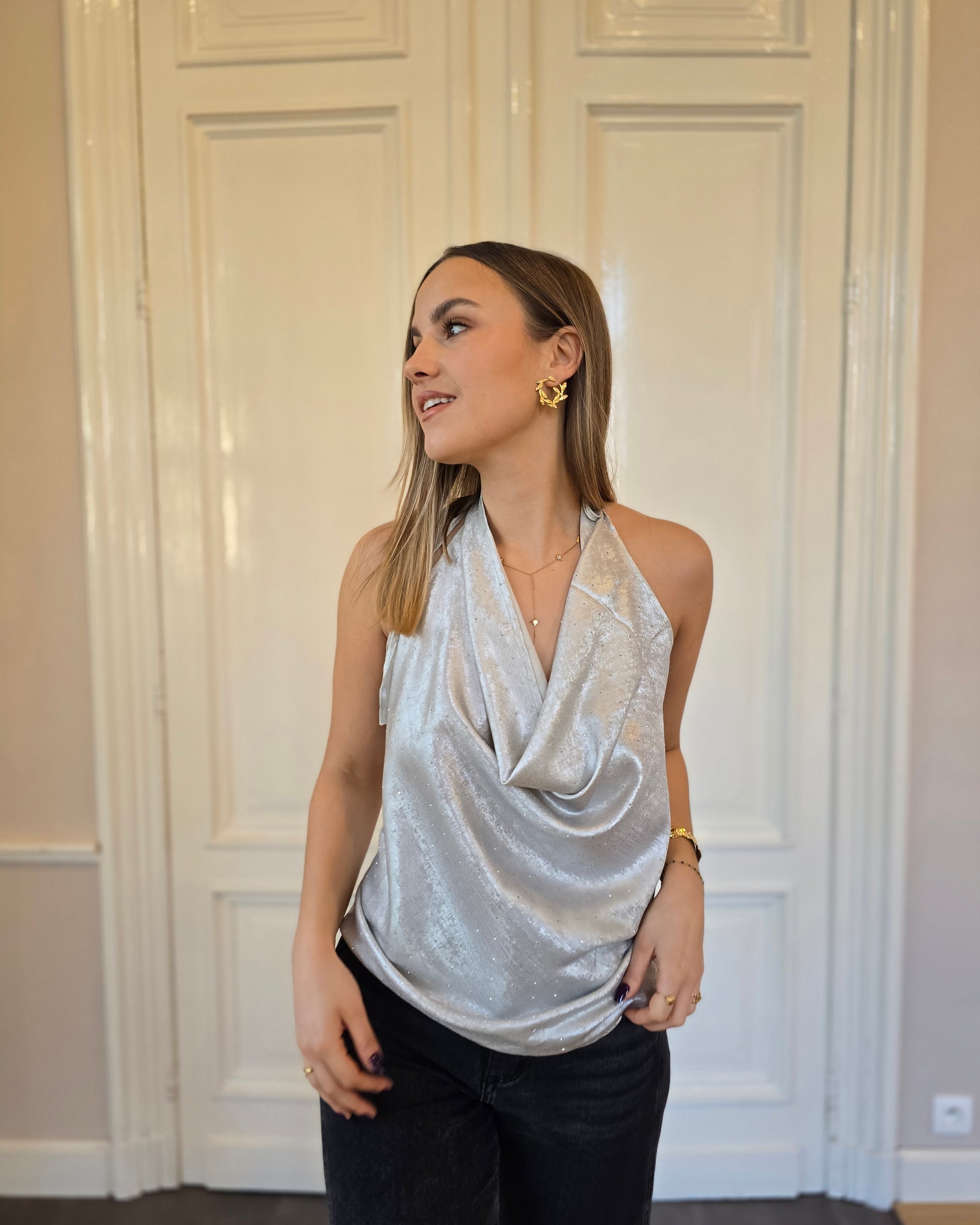 - Top drapé scintillant effet satin