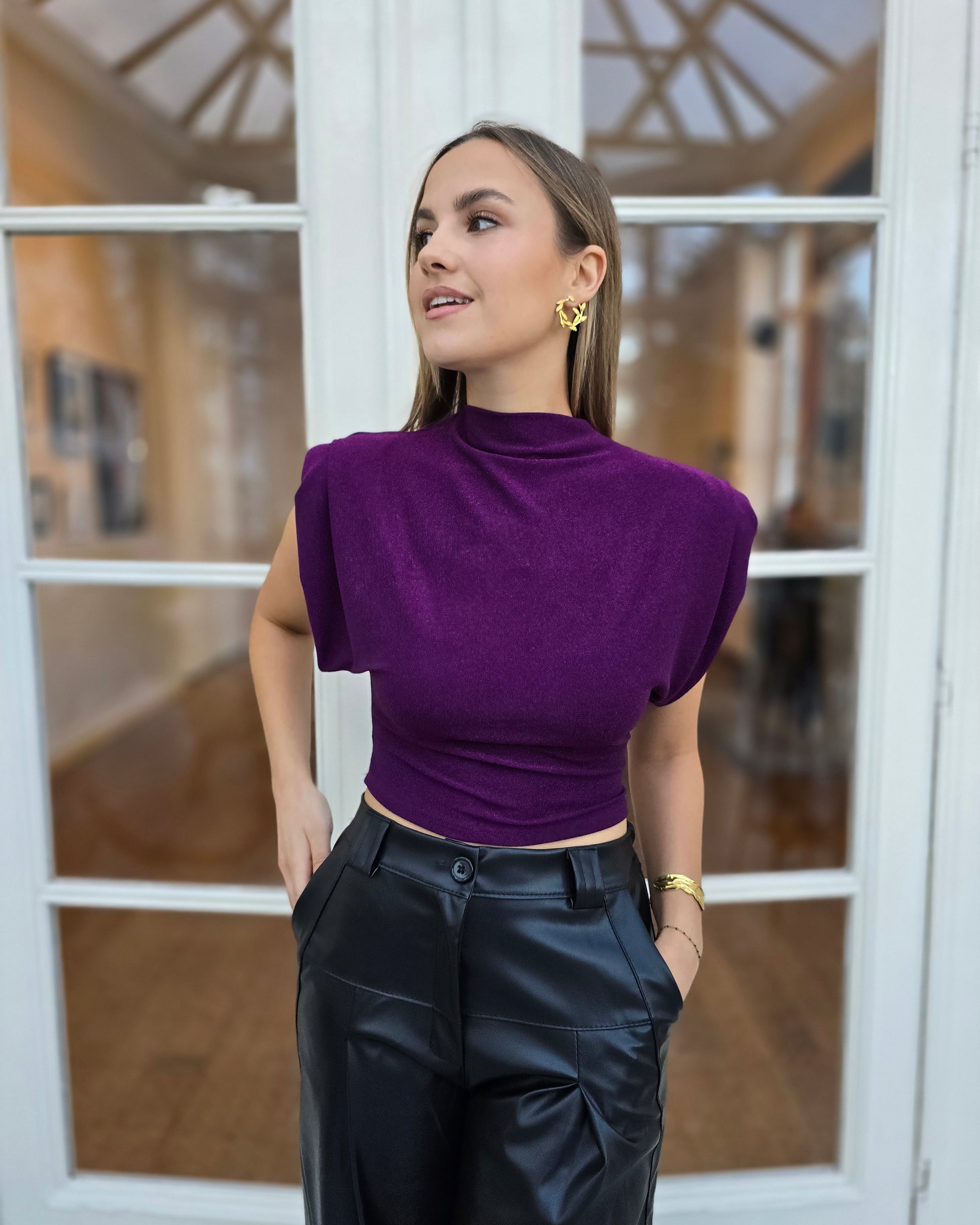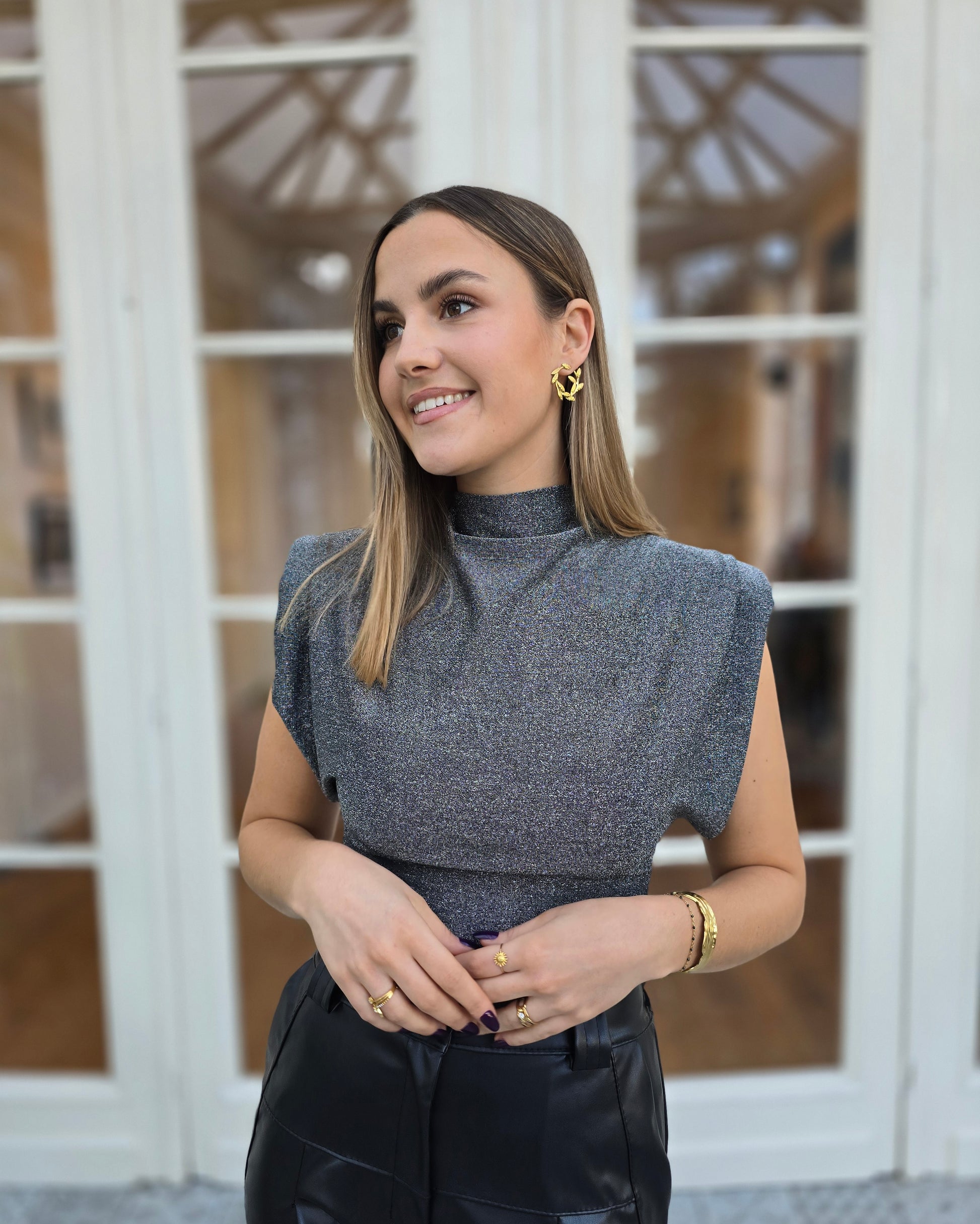 Le top OLYMPE est la pièce chic et moderne qui illumine un look en un instant. Sa maille lurex légèrement scintillante, son col montant et ses épaules structurées créent une silhouette élégante et affirmée.