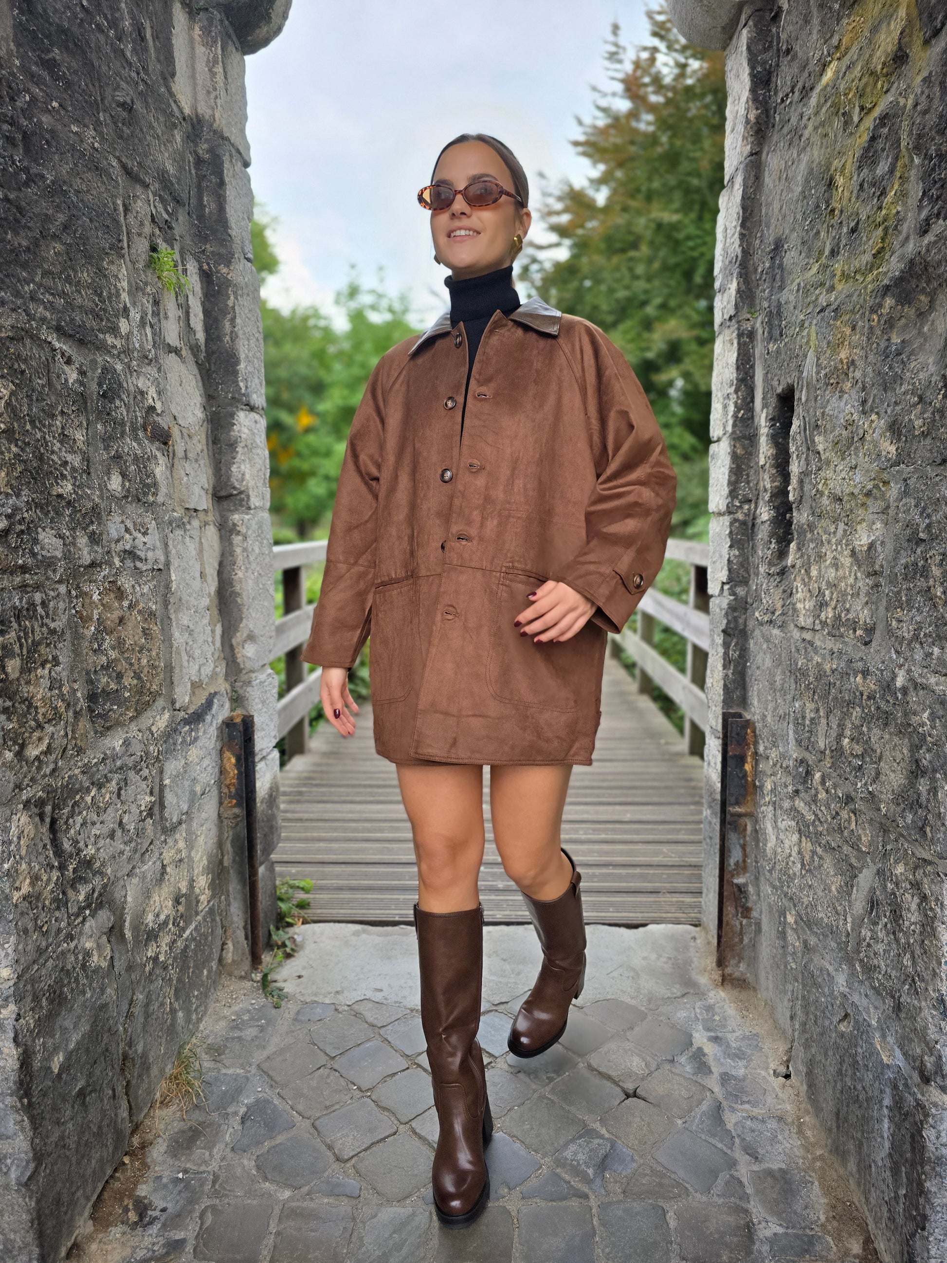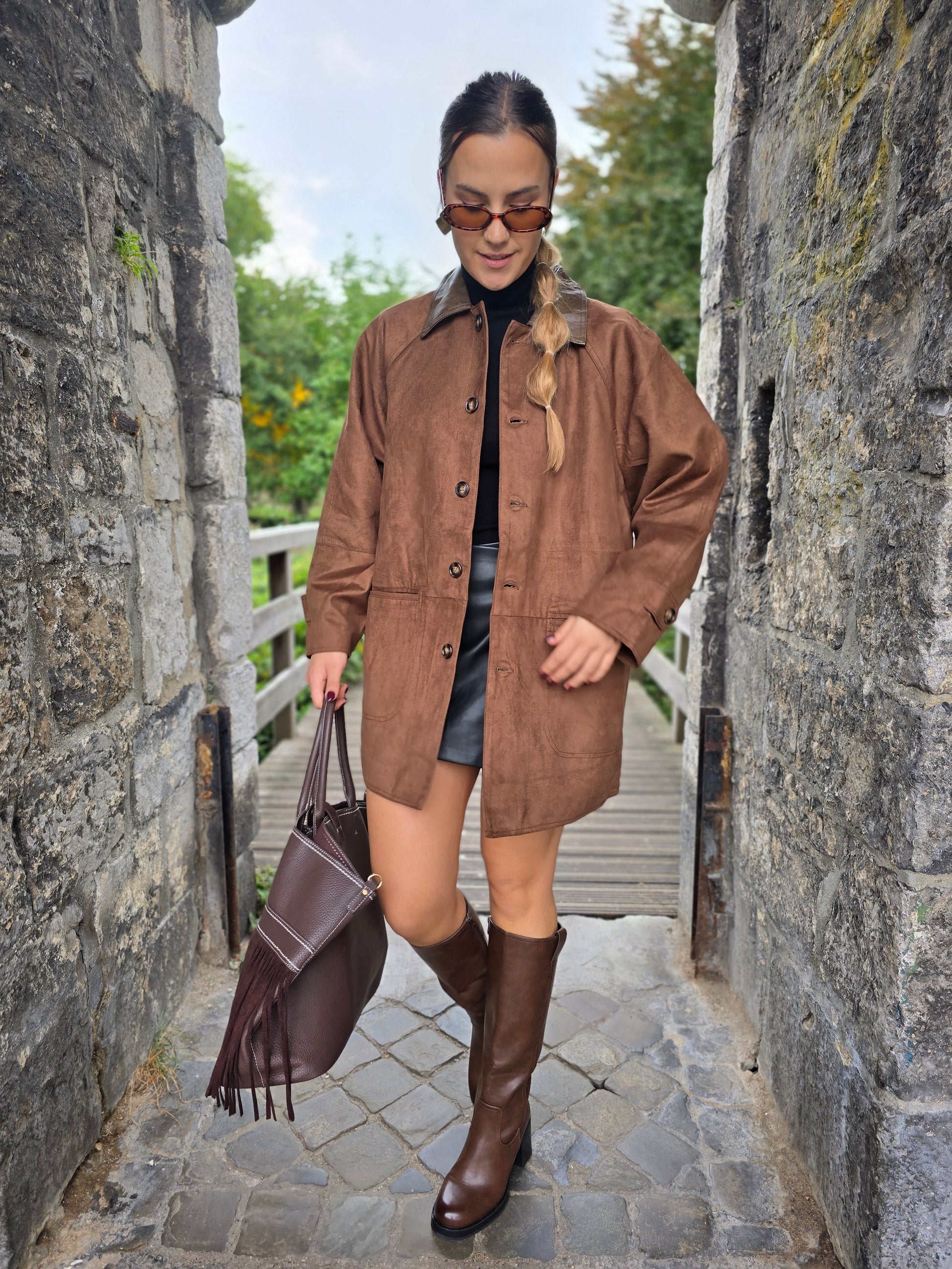 La veste DORA est la pièce maîtresse pour sublimer vos tenues automnales et hivernales. Sa coupe droite oversize et sa texture effet daim apportent un style sophistiqué et tendance, idéal pour les femmes qui aiment conjuguer confort et élégance.